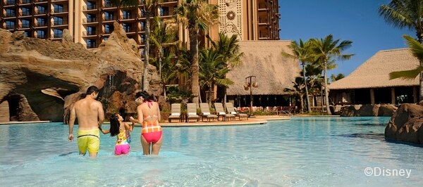 アウラニ・ディズニーリゾート&スパでは、プールやスライダー、ラグーン、ジャグジーなど水遊びができる施設が充実。(写真上)