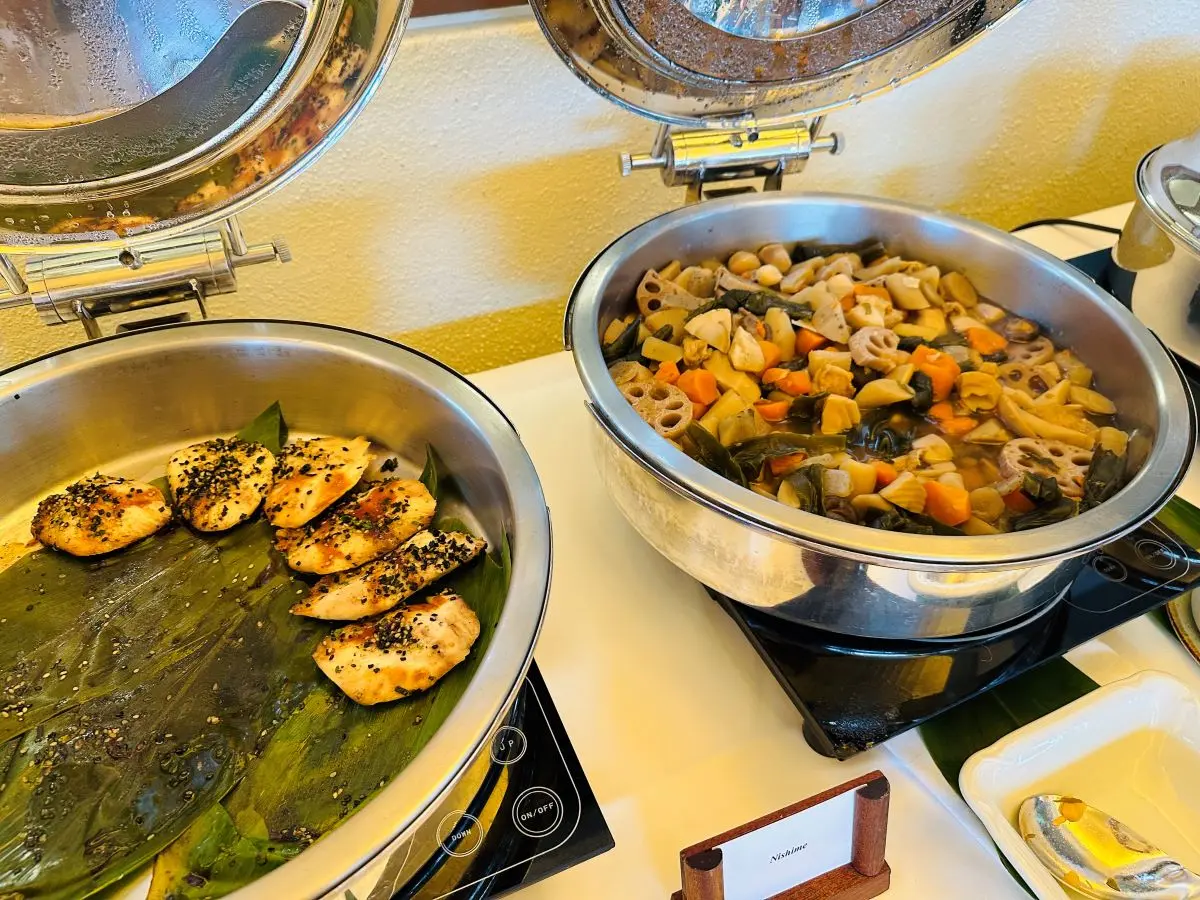 オムレツコーナー(写真上)では、野菜やハム、ベーコン、キノコ、スモークサーモンなど、好きな食材を入れたふわふわの美味しいオムレツをその場で作ってくれますよ。