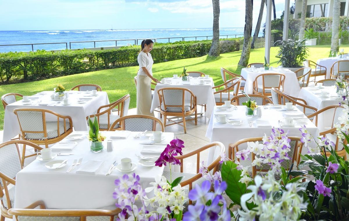ダイヤモンドヘッドとワイキキビーチを一望のレストラン・オーキッズ(写真上)は、朝食、ランチ、アフタヌーンティー、ディナーの全ての時間で食事を楽しめるレストラン。