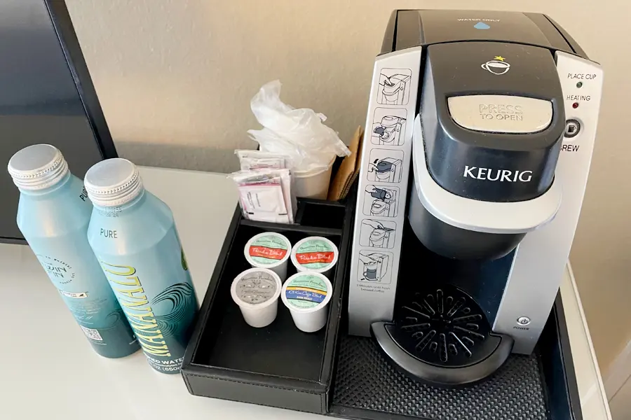 クイーン・カピオラニ・ホテルにも全室にウォーターボトルを配置。ウォーターサーバーも館内各所に設置されているので水の補充に便利ですよ!(写真上)