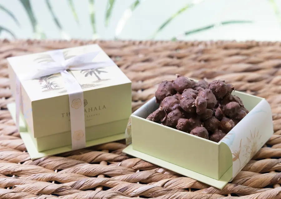 カハラホテルに行かずしてカハラホテルのギフトが購入できます。一歩上を行くハワイのお土産にはカハラホテルのグルメギフトはおすすめです!(写真上:マカデミアナッツチョコレート)