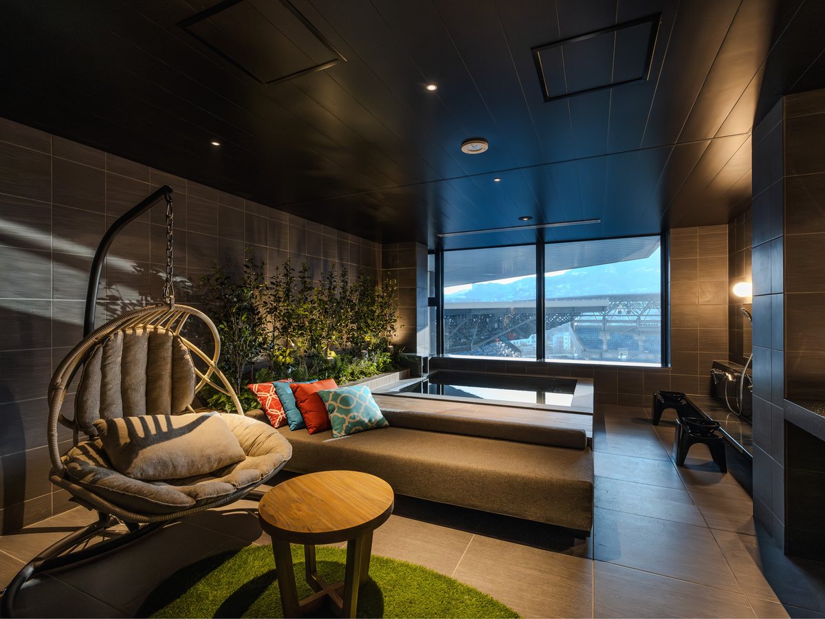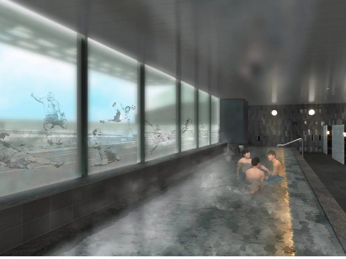 スタジアムは常時開放されているので、客席でランチを楽しめたりもできますよ。試合のない日もスタジアムに入れるとは、さすがジャパネット!(写真上:ホテルの大浴場、写真下:家族風呂)