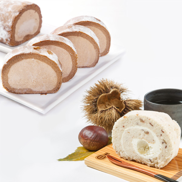 カットした果肉の甘さとクリームが絶妙なバランスのロールズピーチ(写真上)、渋皮栗の粒入りのマロンクリームが入ったふわふわのマロンスターロール(写真上)や渋皮入栗きんとんロール(写真下)、